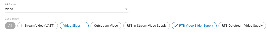 キャンペーン設定のステップ1で、広告フォーマットとして動画を選択します。スライダーはゾーンタイプで、すべての動画キャンペーンはデフォルトでスライダーをターゲットにします。
