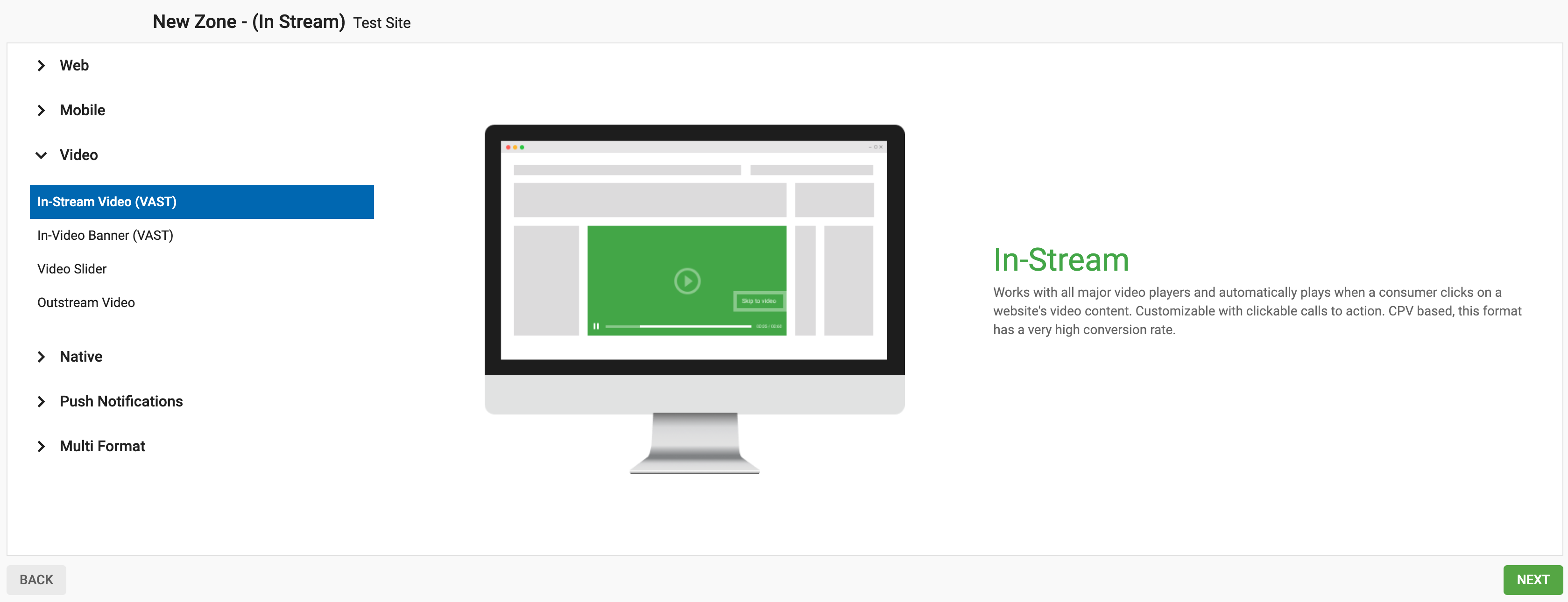 Videoドロップダウンメニューをクリックし、In-Streamを選択し、Next**をクリックします。
