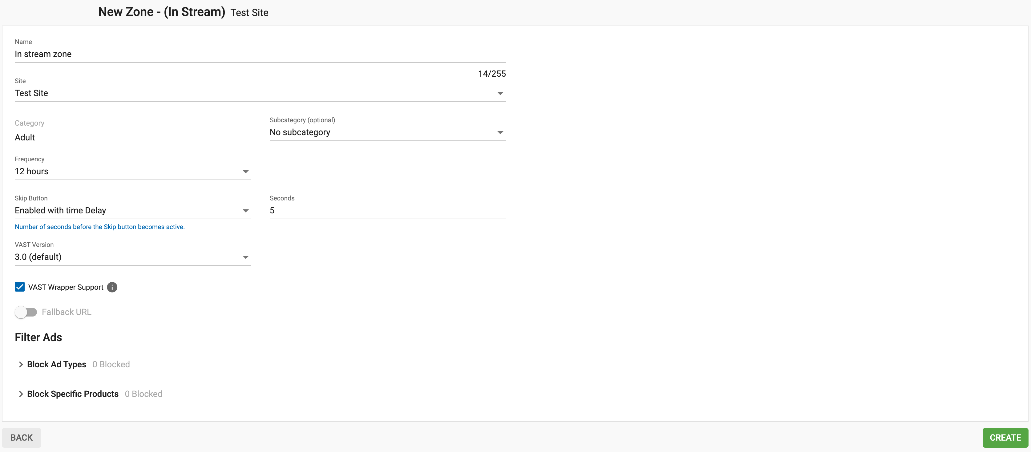 次に、インストリーム広告ゾーンの設定をすべて埋めます。
