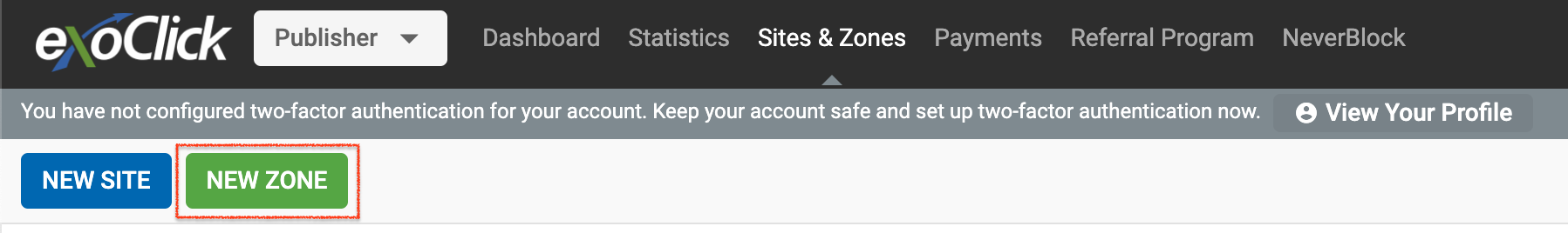 まず、Sites & Zonesタブに行き、New Zoneをクリックします。
