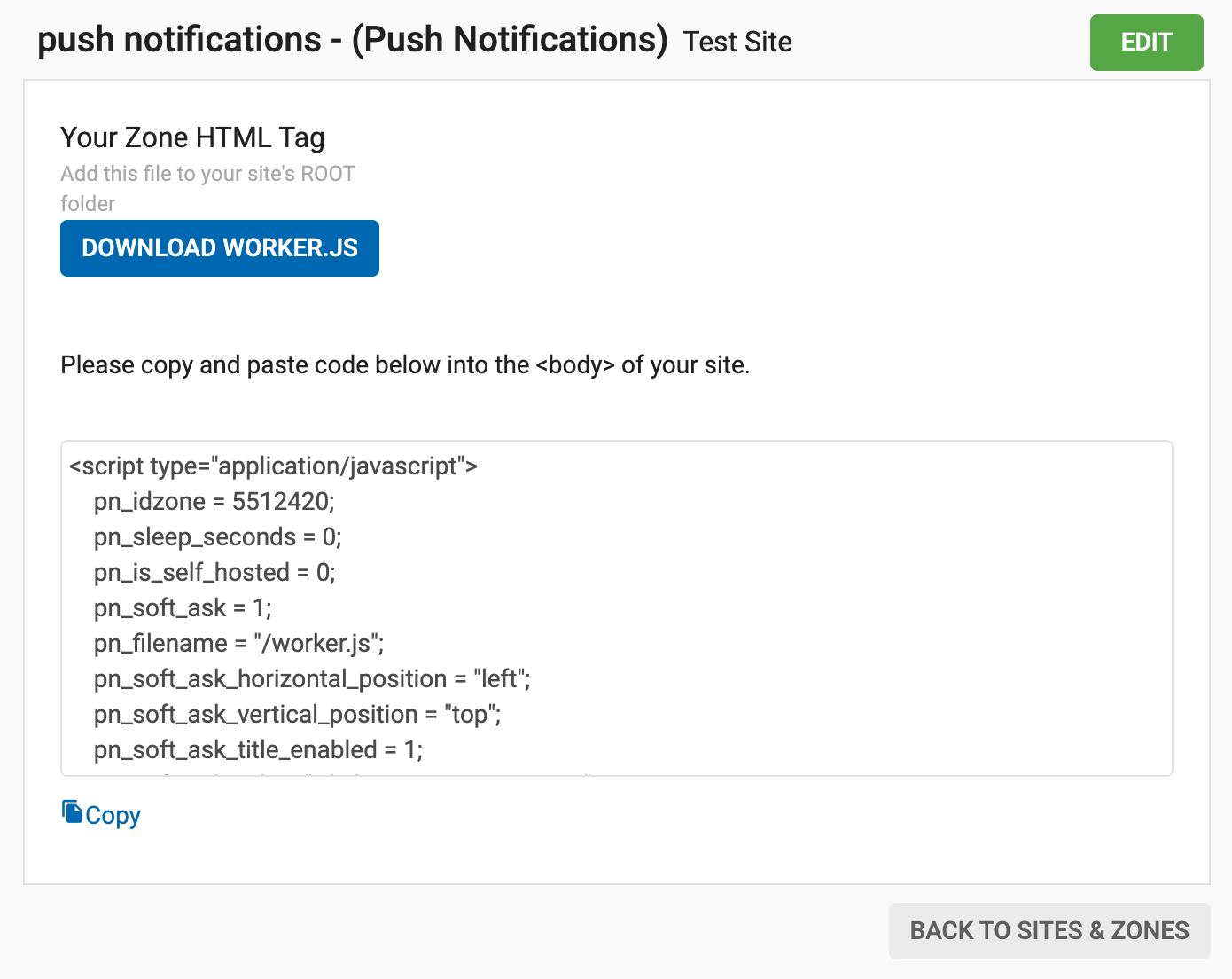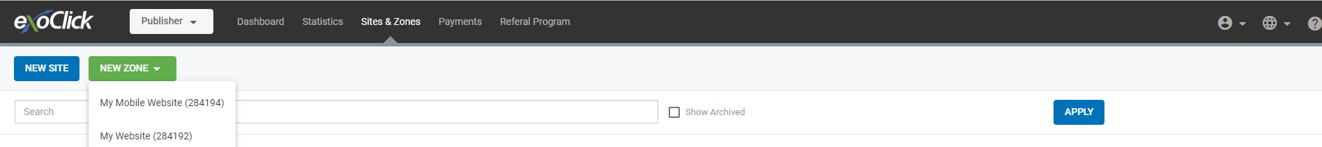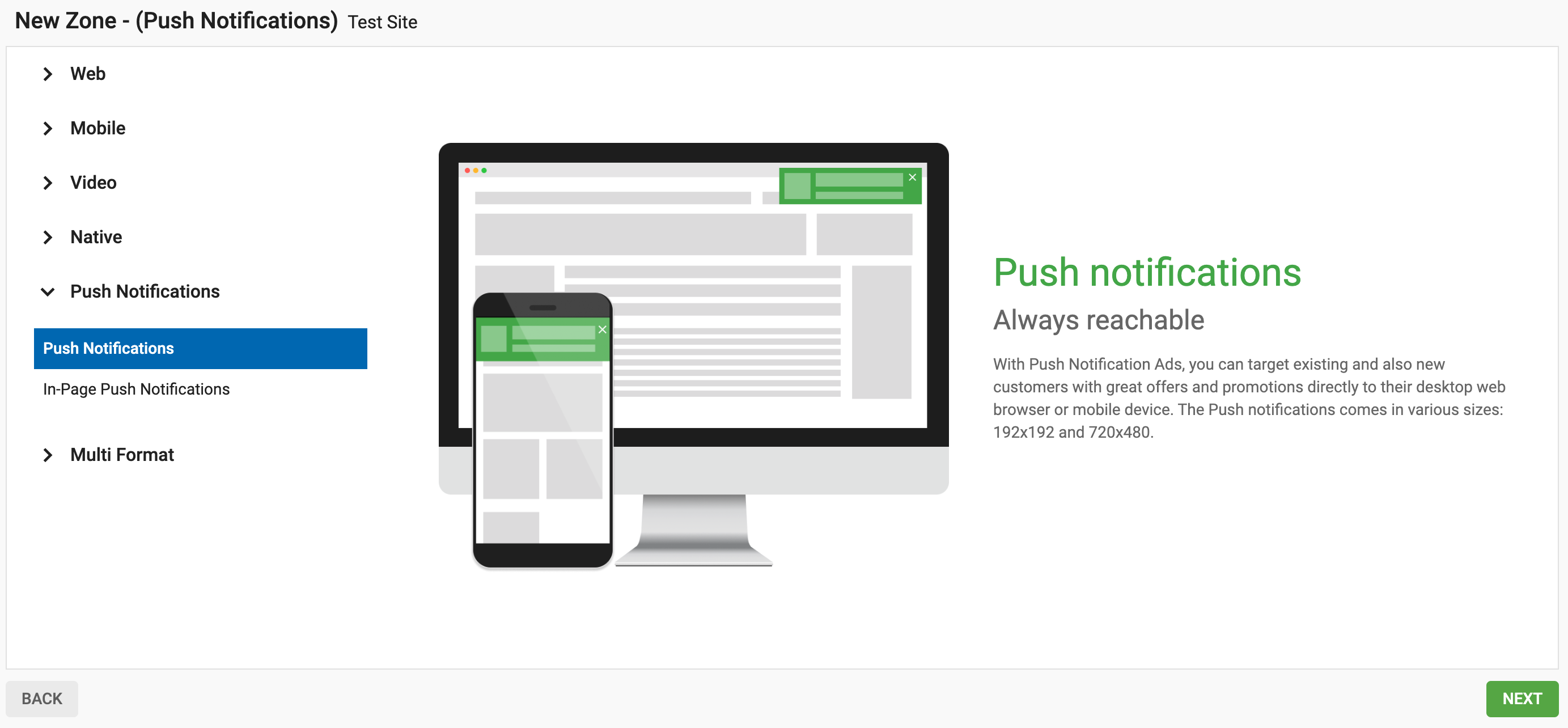 管理パネルのパブリッシャーの下にある「サイトとゾーン」に移動し、「新しいゾーン」をクリックします。プッシュ通知を有効にしたいウェブサイトを選択してください。