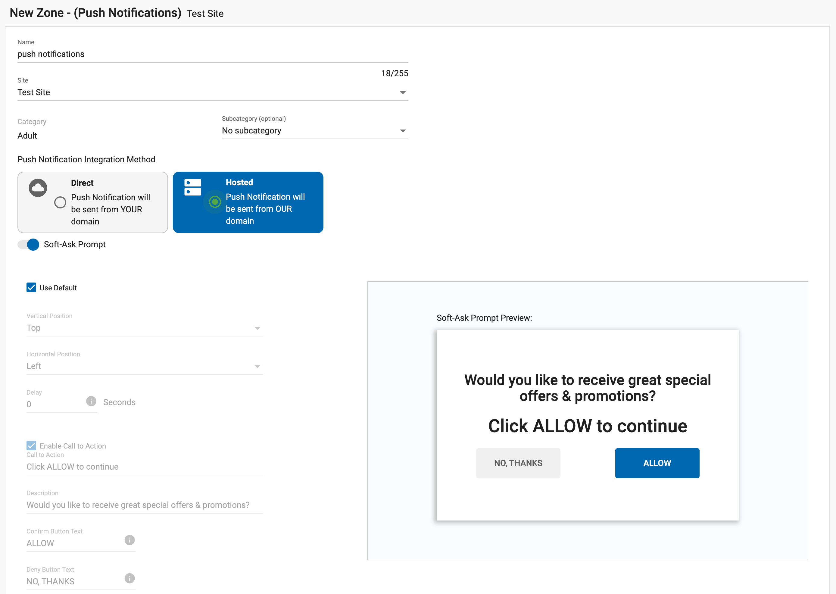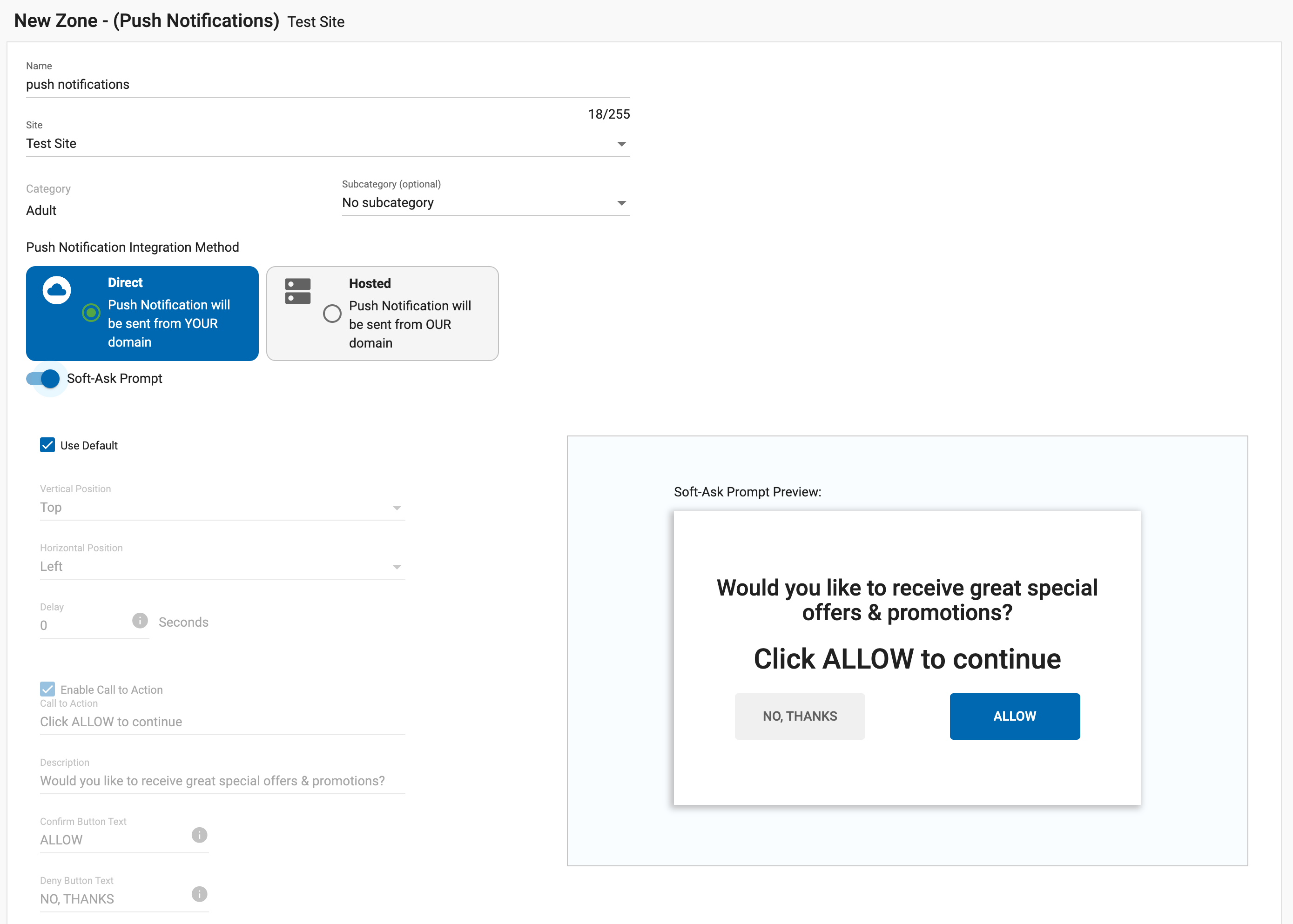 - ソフト・アスク・プロンプトでダイレクトに:これは2ステップのプロセスで、サイト上に2つの連続したオプトインボックスが表示されます。1つ目(ソフトアスク)は、プッシュ通知の受信を希望するかどうかを尋ねるもので、ユーザーはボックス内で「結構です」または「許可します」を選択できます。これを実行するには、Directを選択し、Soft-Ask Promptボタンをオンにします。