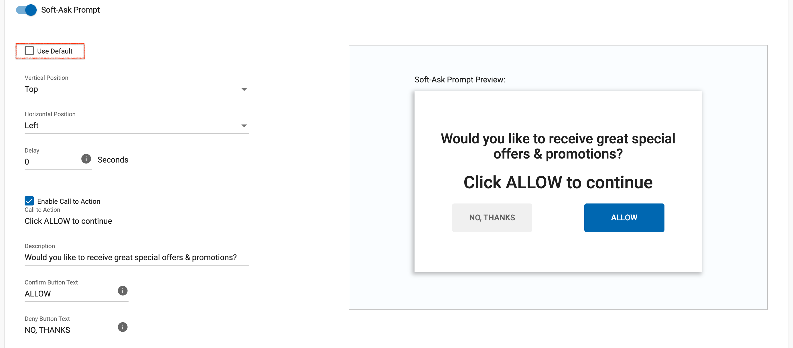 - 遅延:ユーザーがあなたのサイトに到着するとすぐにSoft-Askプロンプトボックスが表示されるように、5秒未満に設定することをお勧めします。