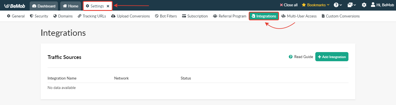 - Зайдите в Настройки вашего аккаунта BeMob.