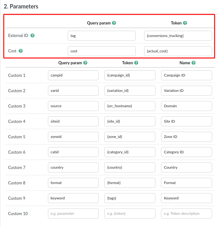 В разделе Параметры от Bemob единственным обязательным параметром, необходимым для отслеживания конверсий, является внешний ID, все остальные - по желанию. Вы всегда можете найти все доступные токены в нашем разделе для рекламодателей