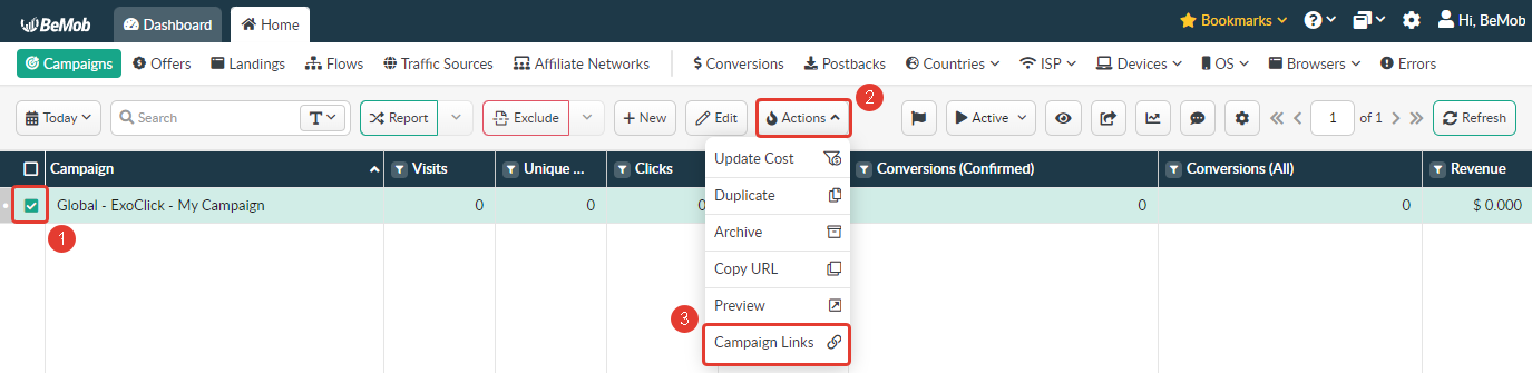 Шаг 3: Создайте кампанию с ExoClick в качестве источника трафика в BeMob